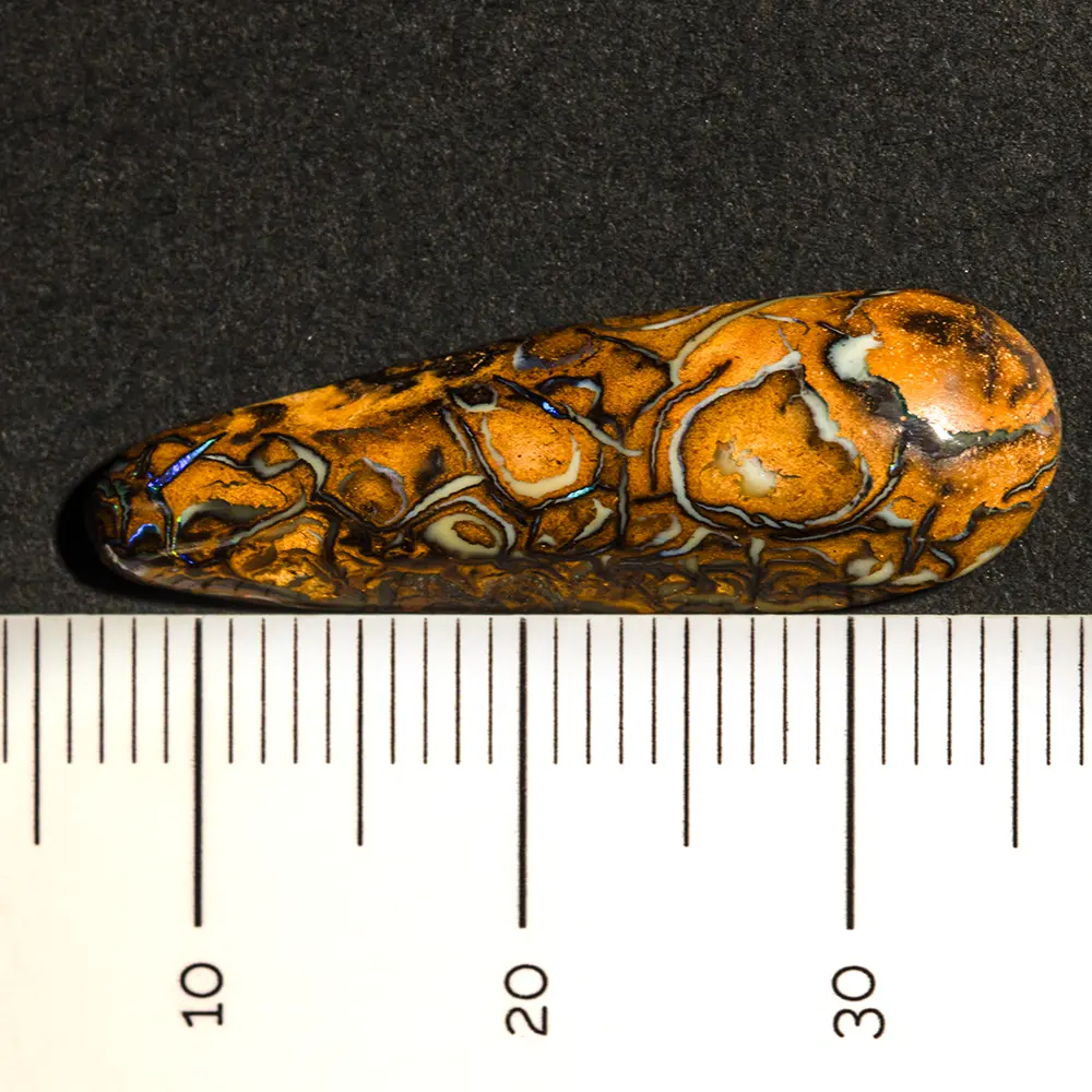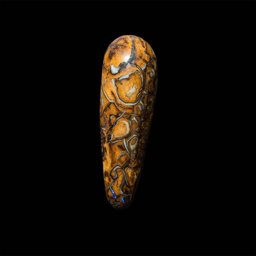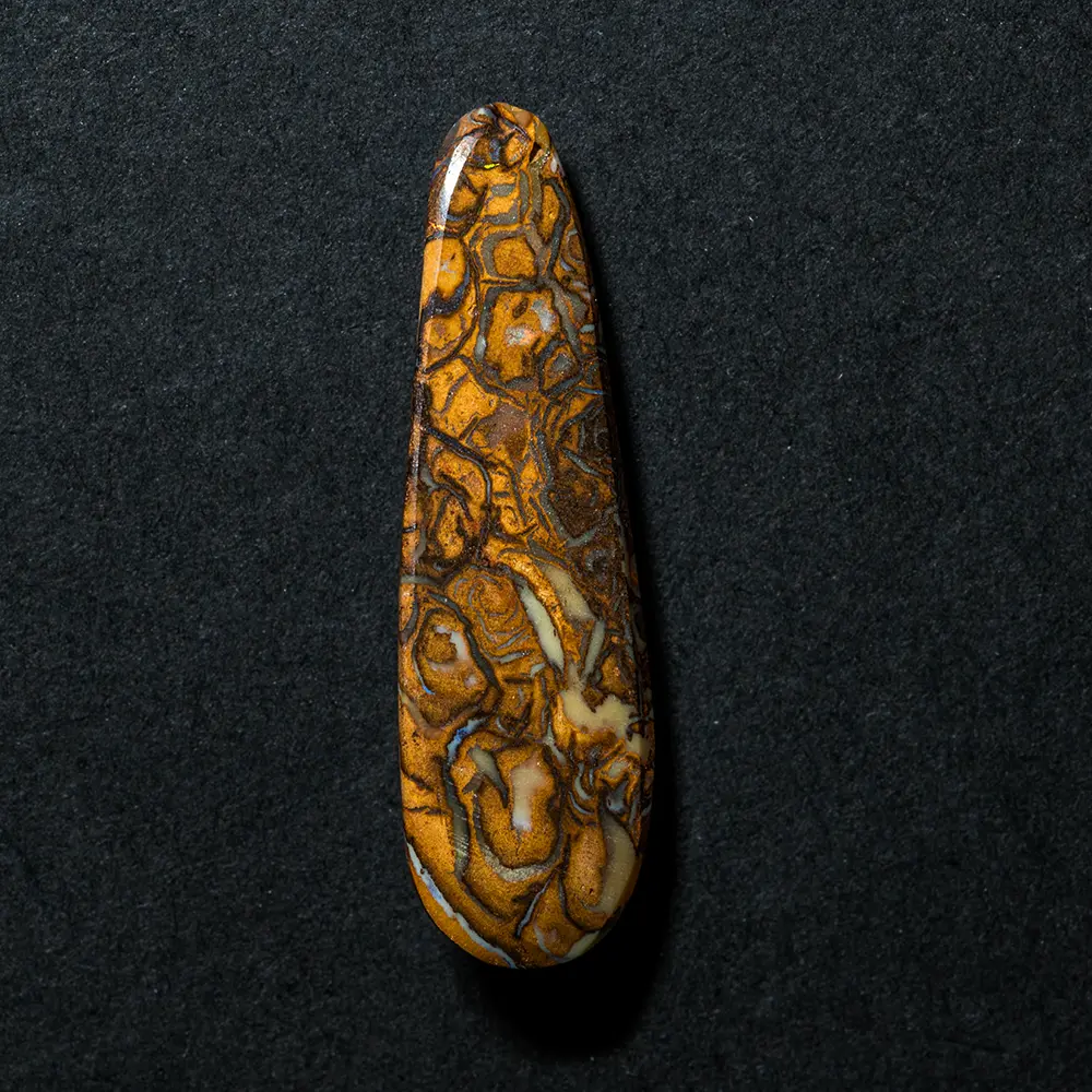 Opale naturelle australienne des mines Koroit. Forme de larme fine de 9,4 carats à matrice ocre jaune sillonnée de tracés sombres ou clairs de matrice iridescentes bleue, verte et orange.
