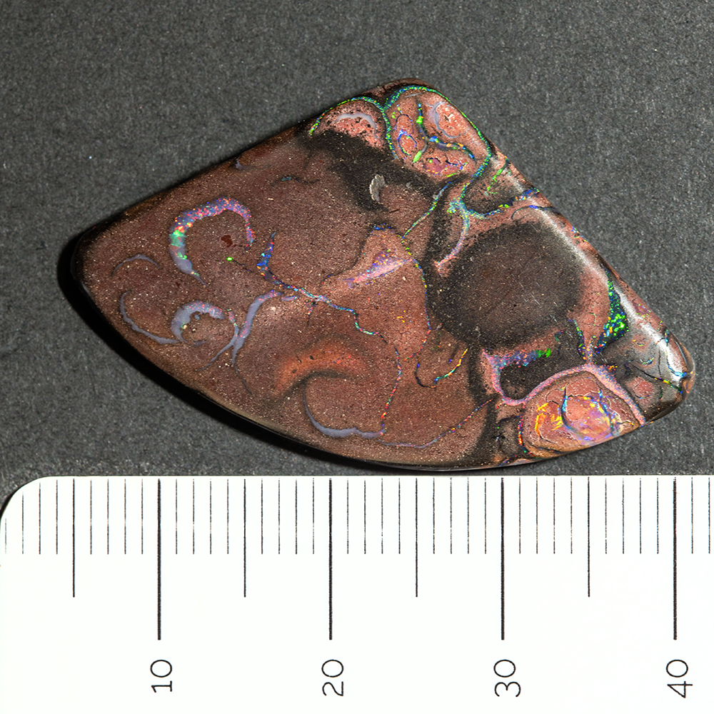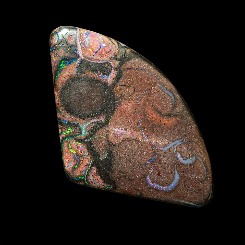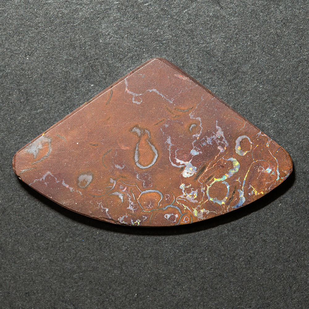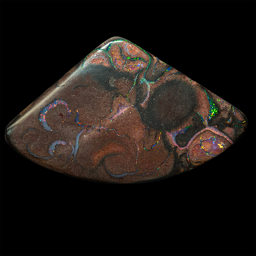 Opale naturelle australienne des mines Koroit, forme de triangle arrondi aux angles évoquant un éventail de 18,6 carats, matrice brune décorée d’arabesques andalouses irisées vertes et multicolores