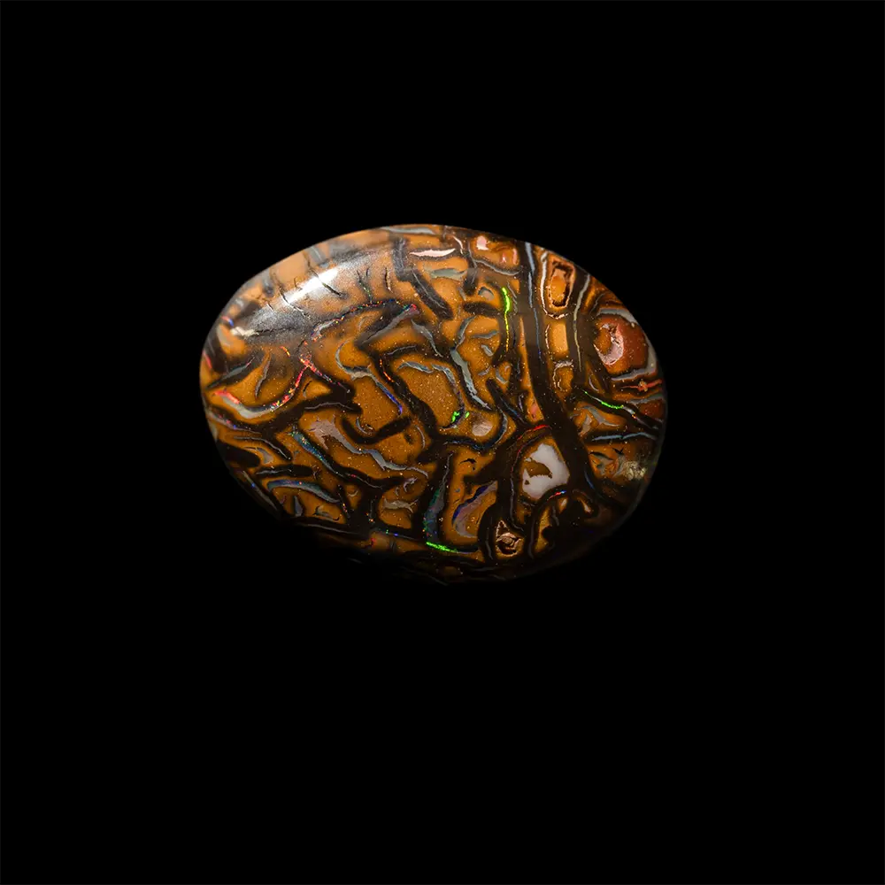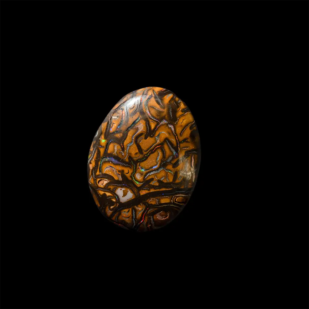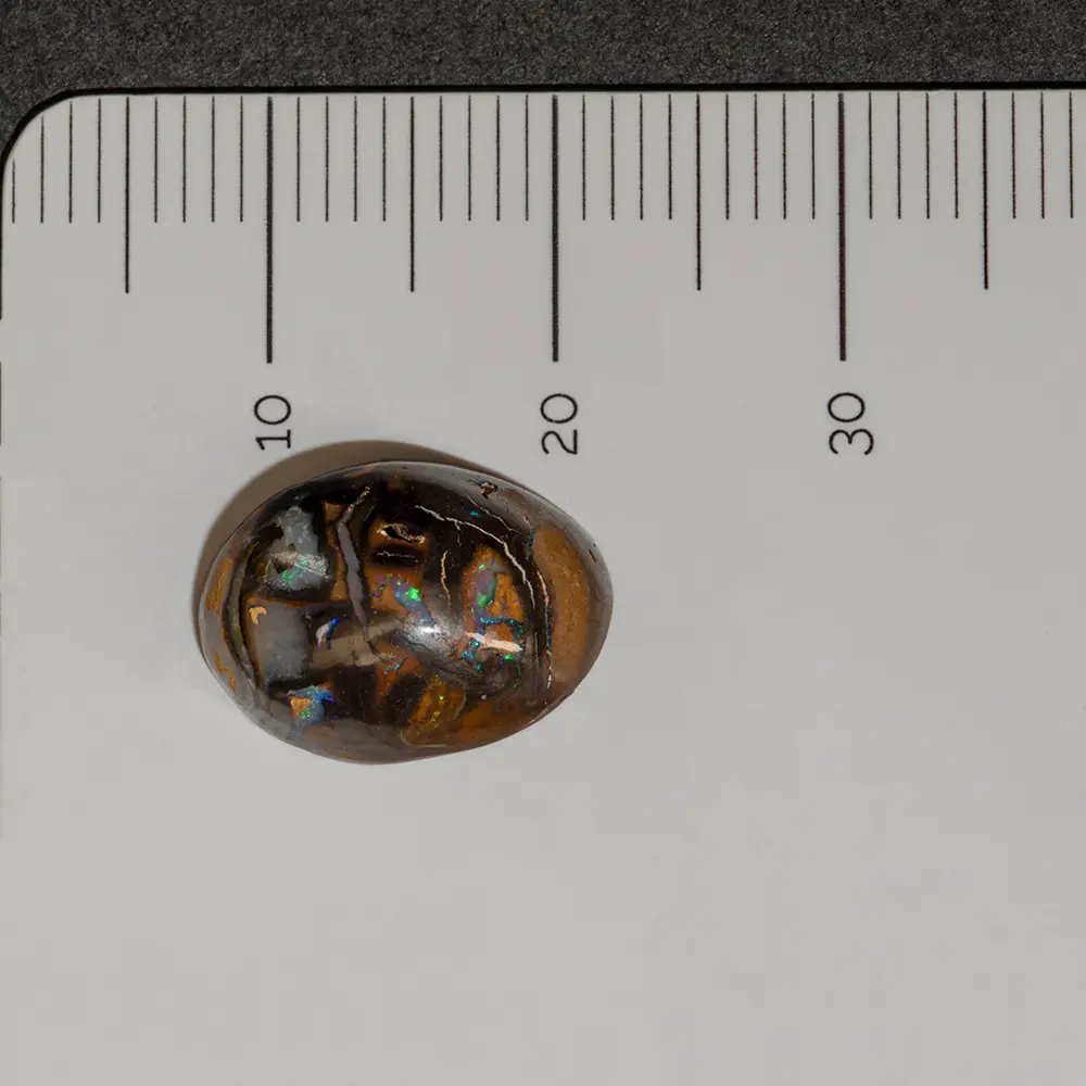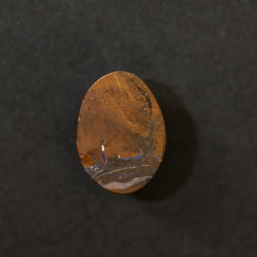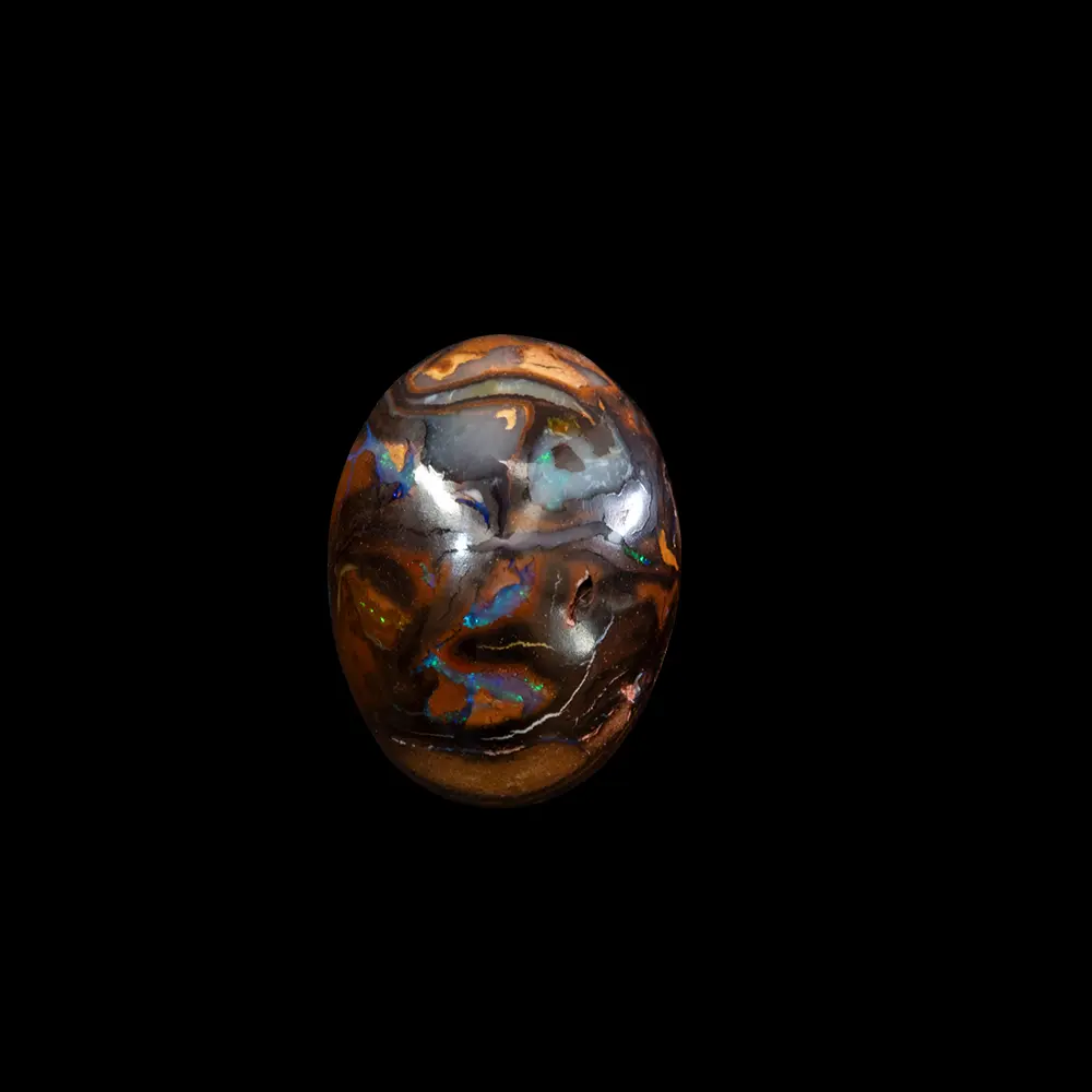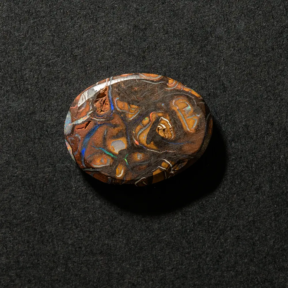 • le cabochon d’arène d’opale Koroit KOR17-001 (5,9 carats de dimensions14,0x10,5×5,4 mm), matrice brune et ocre constellée d’aplats et lignes irisées à dominante bleu et vert
