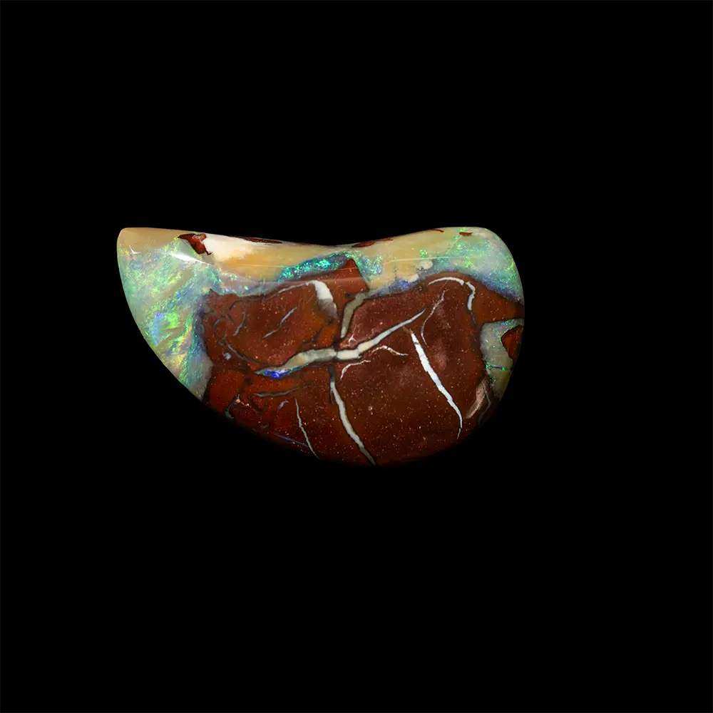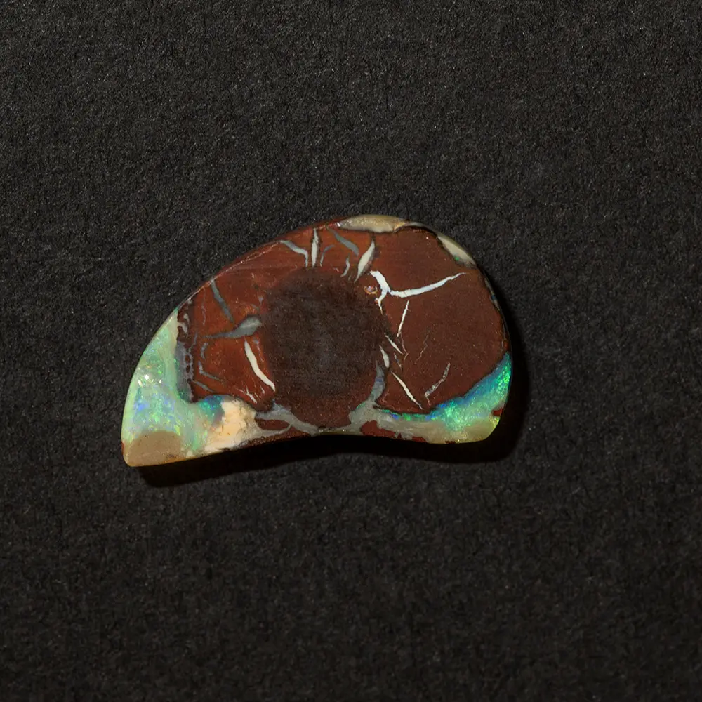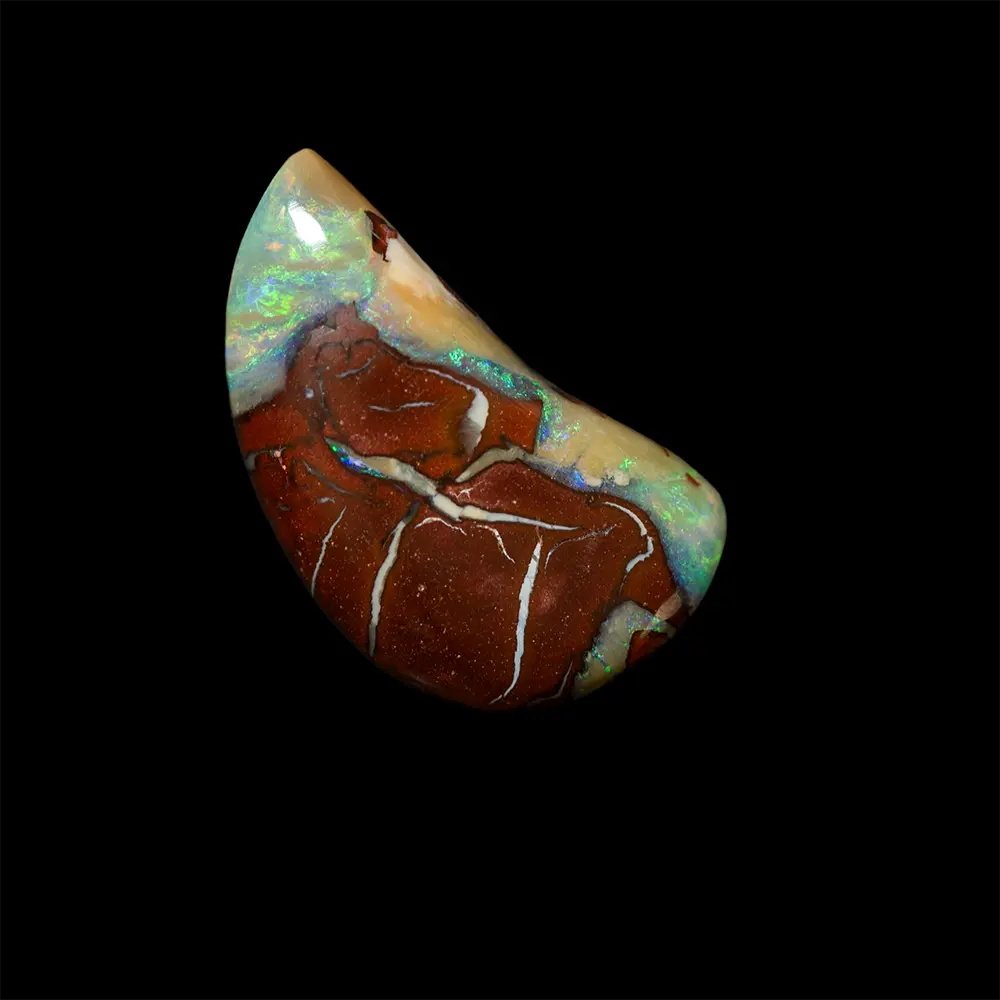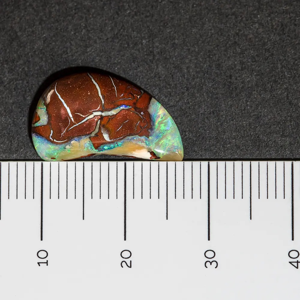 • l’opale Koroit  KOR17-014 (4,9 carats de dimensions 18,2×10,7×3,3mm) , en forme de demi poire inversée évoquant un demi cœur de 4,9 carats, matrice grenat soulignée de blanc et encadrée d’une zone très irisée bleu vert