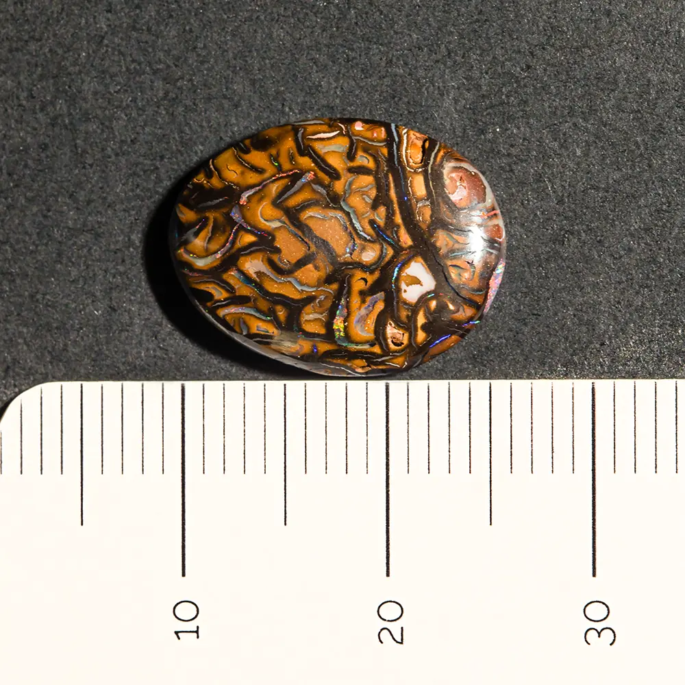 • l’opale Koroit zébrée KOR17-009 (6,1 carats de dimensions 16,6×12,6×3,5mm) à matrice brun-orangé zébrée de lignes noires et fines lignes irisées vertes, multicolores, violets, rouges