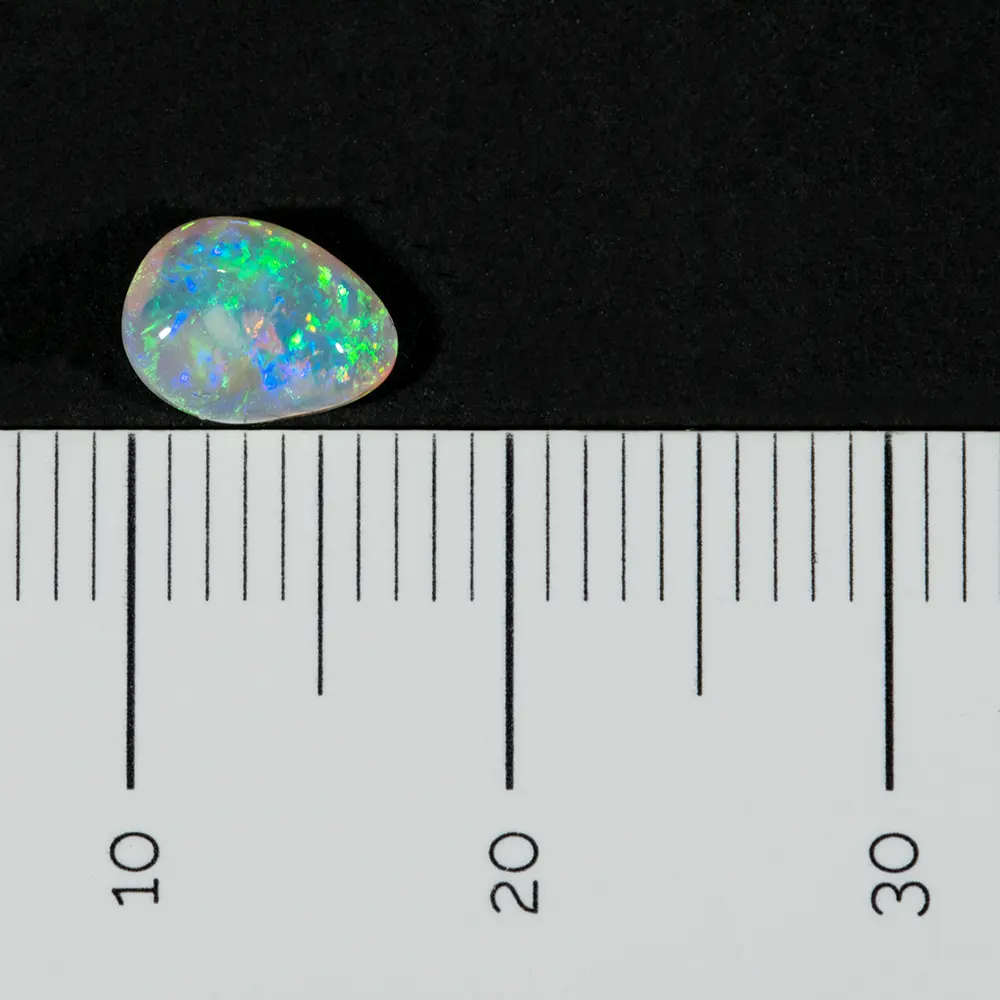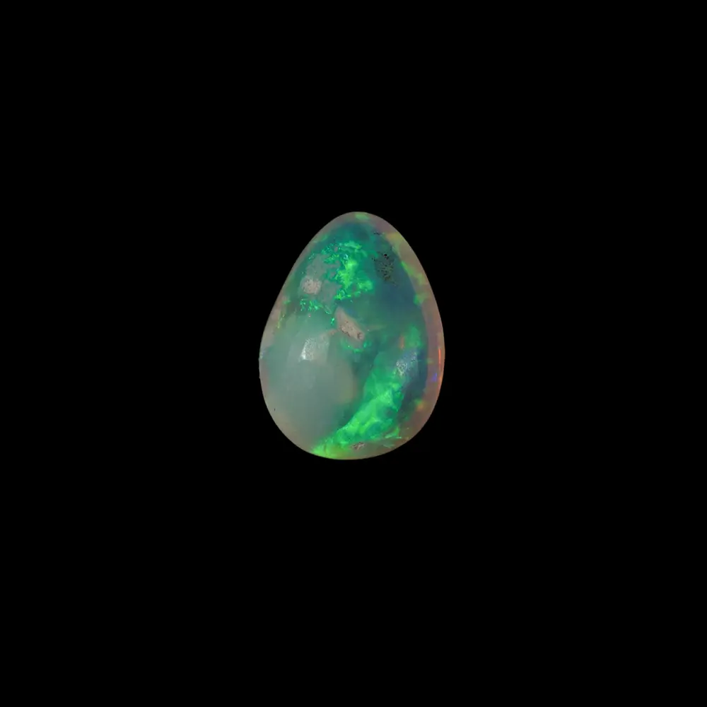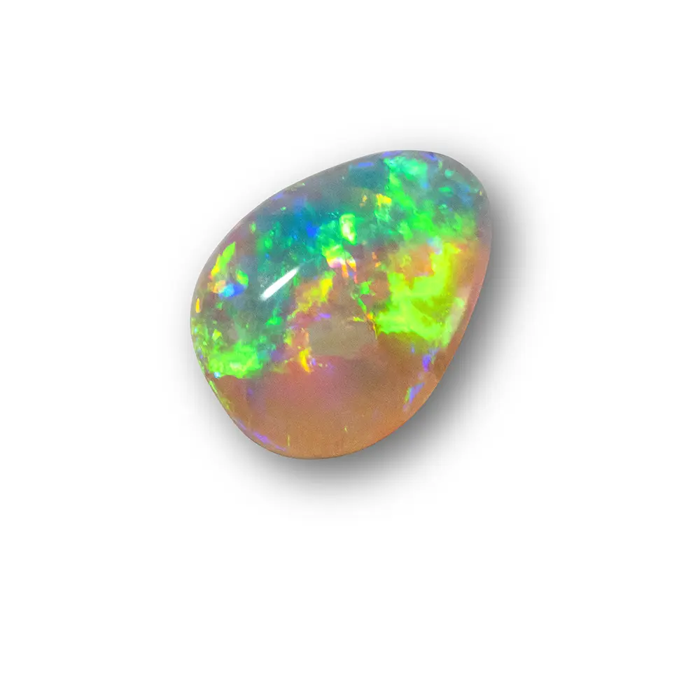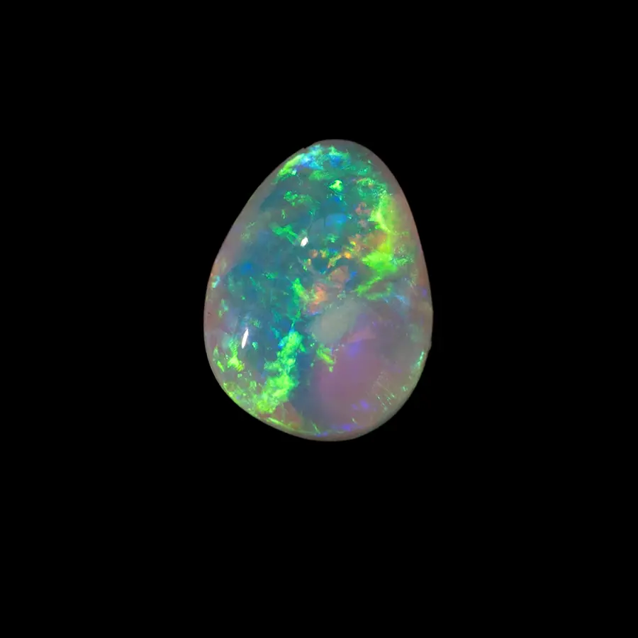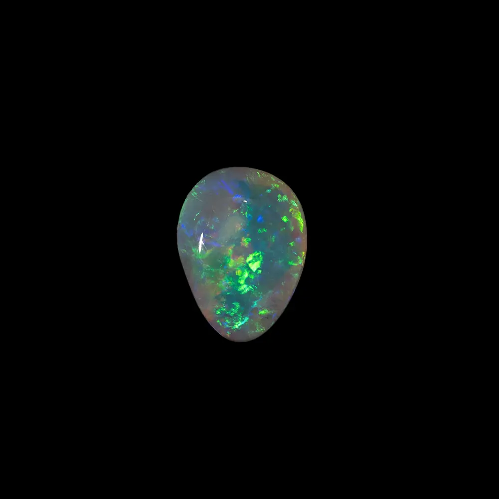 Opale naturelle australienne des mines de Lightning Ridge, petite forme de goutte de 0,7 carat totalement irisée et très brillante à dominante vert-jaune et bleu-violet agrémentée de pointes d’orange, sa matrice est limpide et très claire. Beaucoup d’éclat et de couleur pour cette belle goutte cristalline.