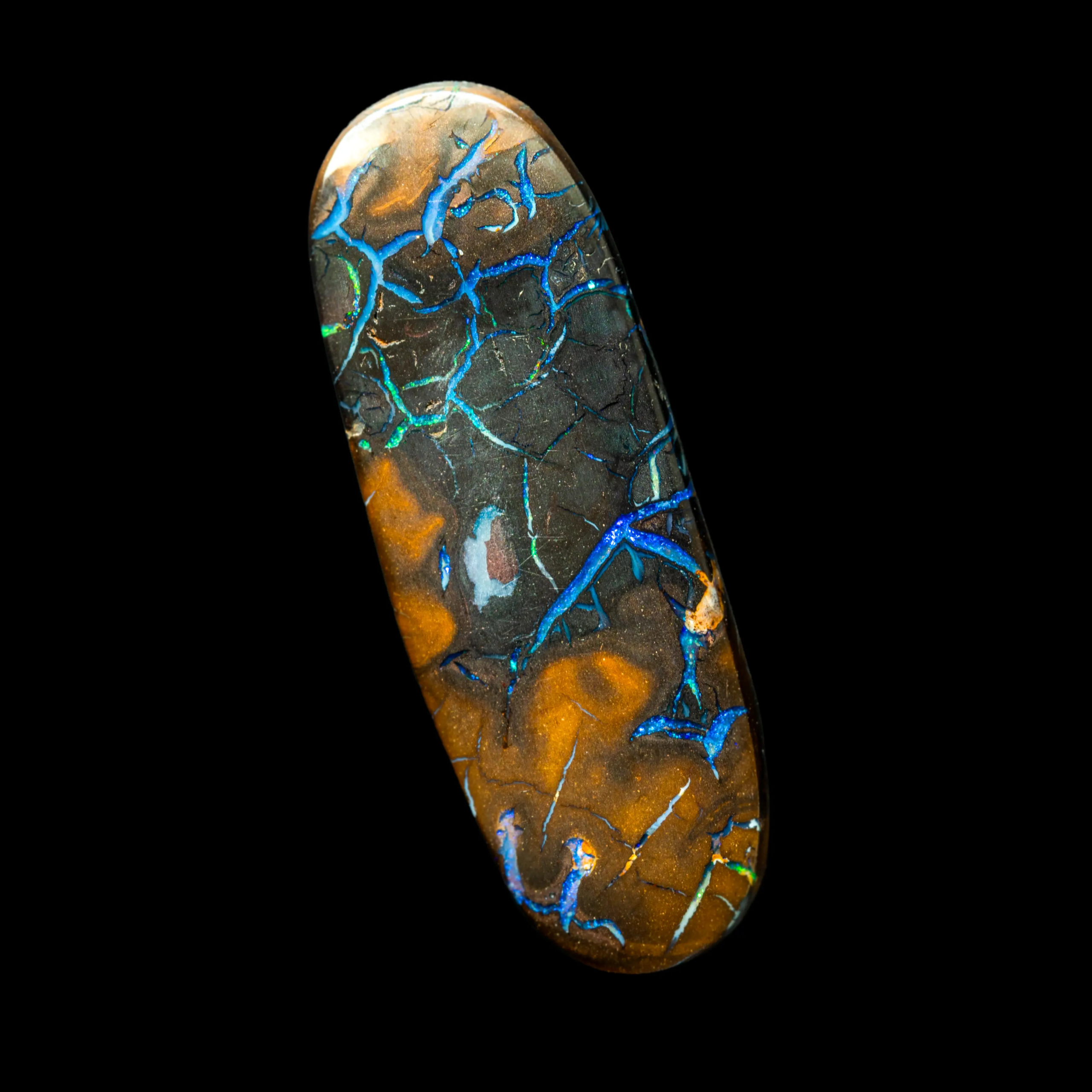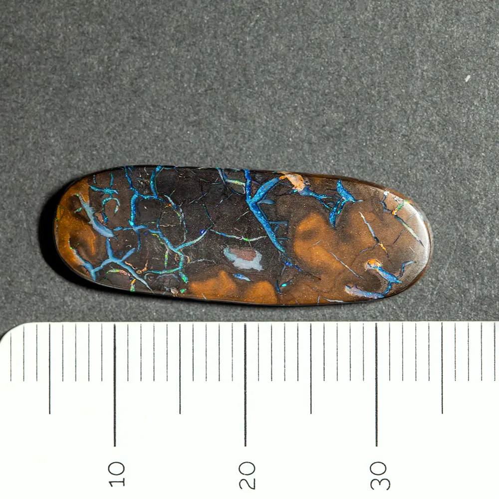 Opale naturelle australienne des mines Koroit, forme oblongue de 10,7 carats à matrice brun sombre et ocre jaune veiné d’opale bleue majoritaire et de quelques veines multicolores
