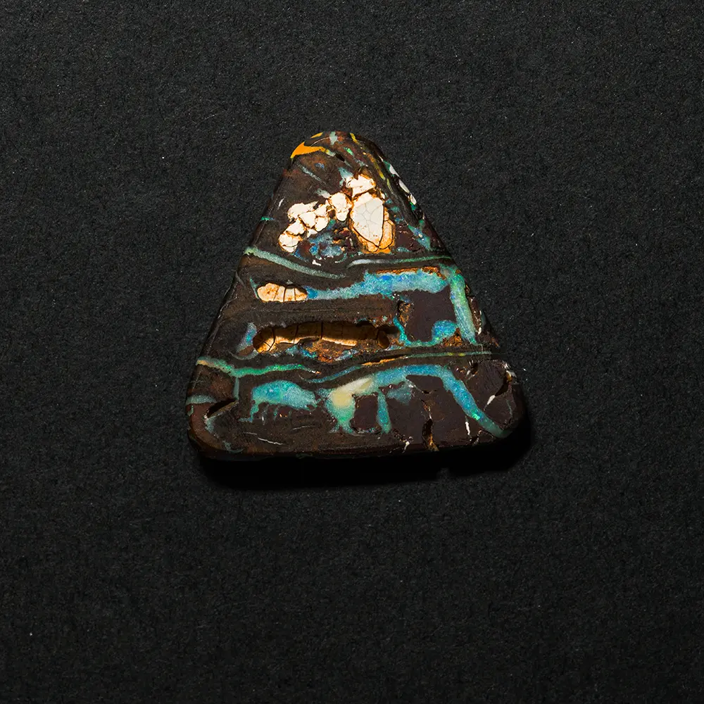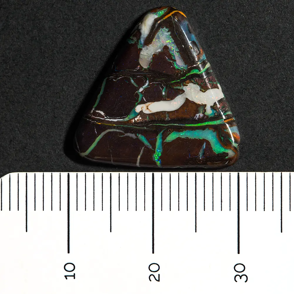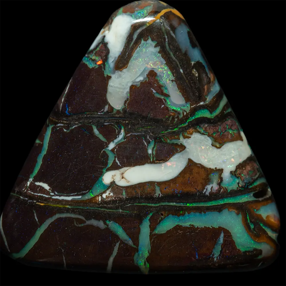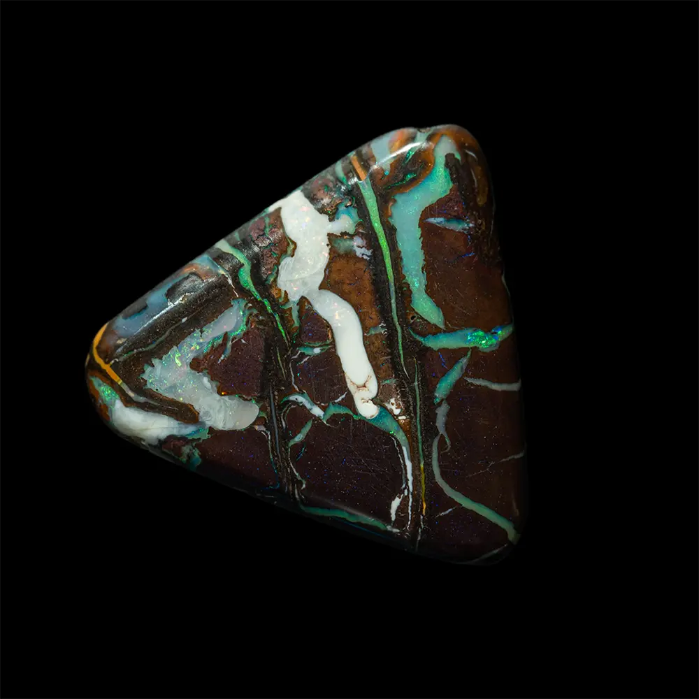 Opale naturelle australienne des mines Koroit, forme triangle à angles arrondis de 8,4 carats. Matrice brun sombre contrastant joliment avec de fines rainures opalisées de vert, blanc irisé ceinturant la forme
